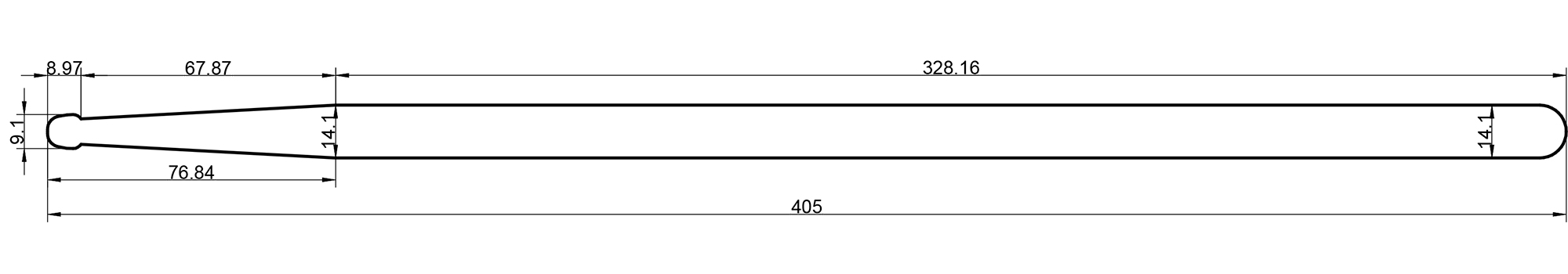 Rohema MSD 3 Drumstick Skizze. Sticklänge gesamt 405mm, Schulterlänge 67,87mm. Sick Durchmesser 14,1mm, Kopfdurchmesser an der breitesten Stelle 9,1mm